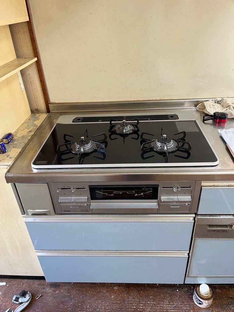 既存コンロを撤去後、設置部の確認・清掃を行い、新しいコンロを設置しています。