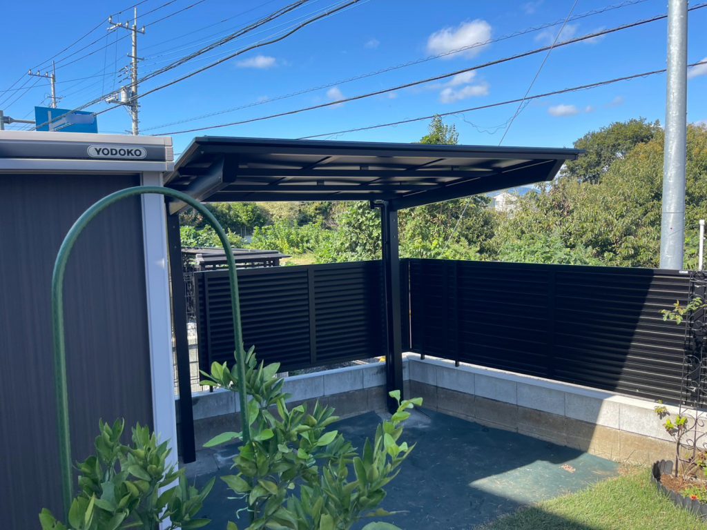 屋根材には**ポリカーボネート〈ブラックマット〉**を採用し、