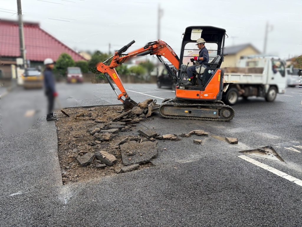 ユンボを使用して傷んだアスファルトを撤去し、補修工事を行いました。