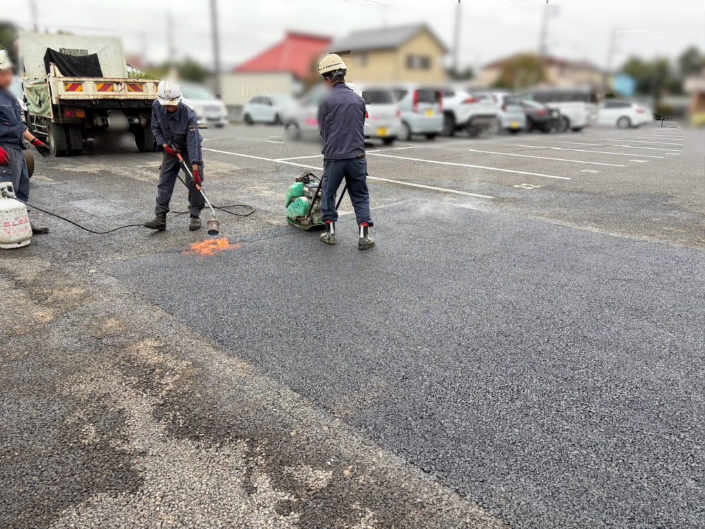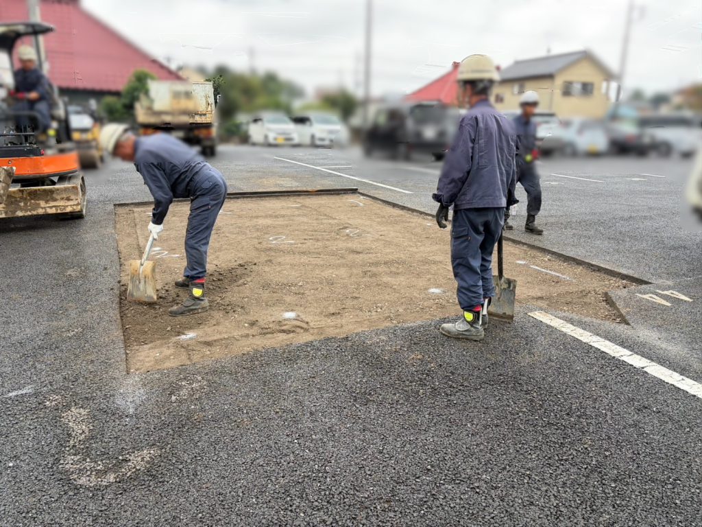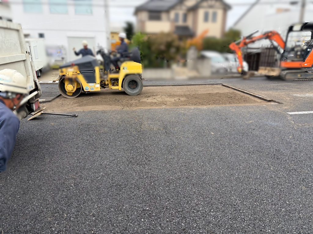 掘削後は地盤を丁寧に整地・転圧し、新しいアスファルトを敷設したうえでトーチによる加熱密着処理を実施。