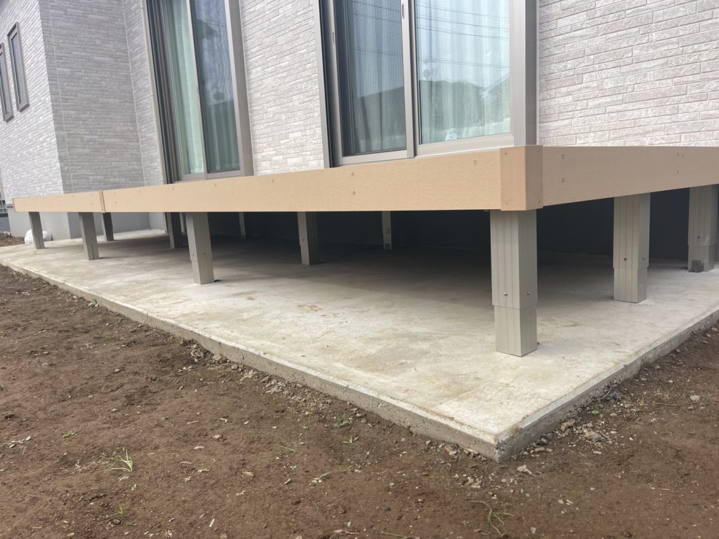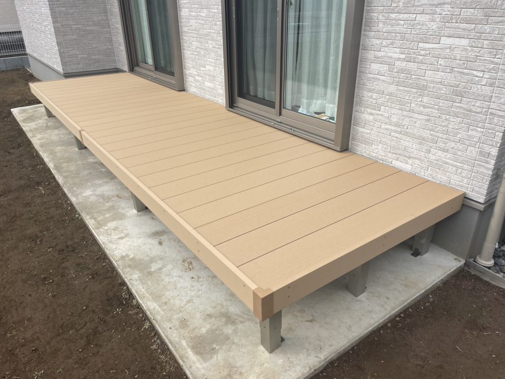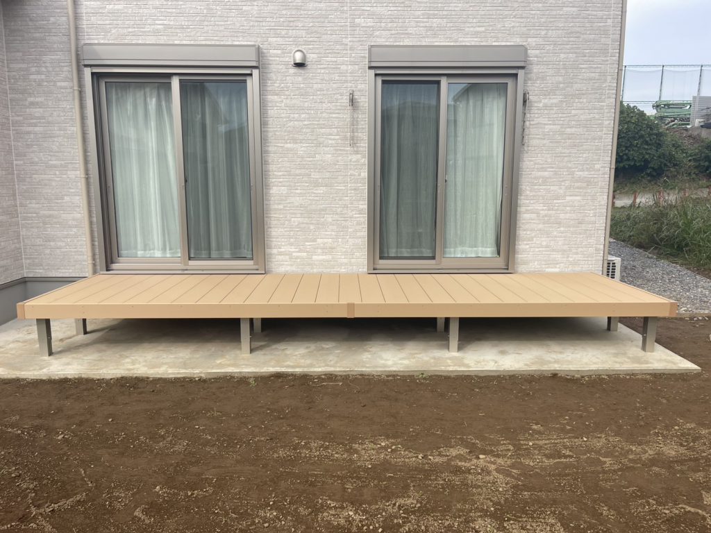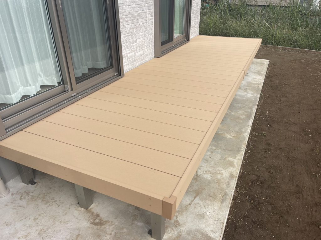 ナチュラルな「ホワイトブラウン」カラーの樹脂製デッキ、YKK AP リウッドデッキ200を設置しました。
