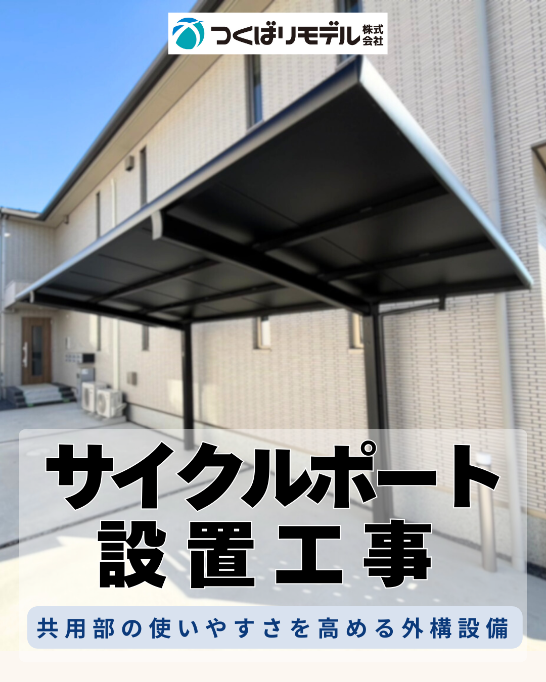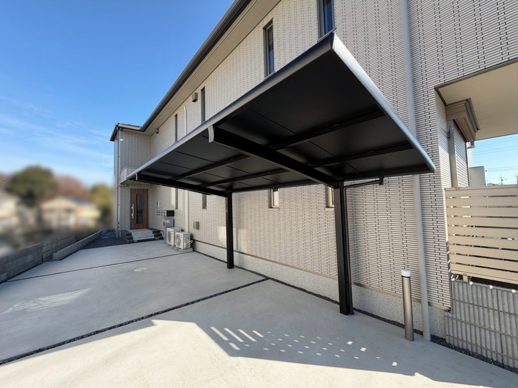 新築アパート外構工事の一環として、共用部に サイクルポート(駐輪屋根) を設置しました。