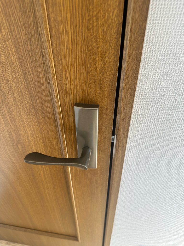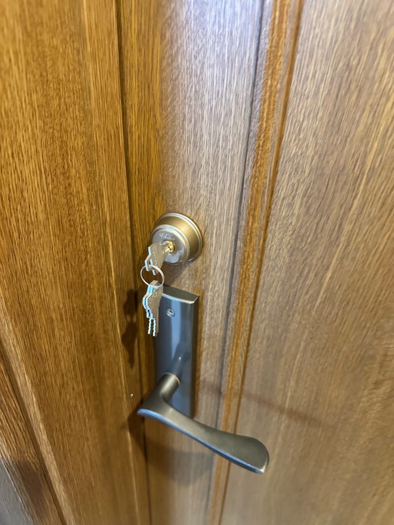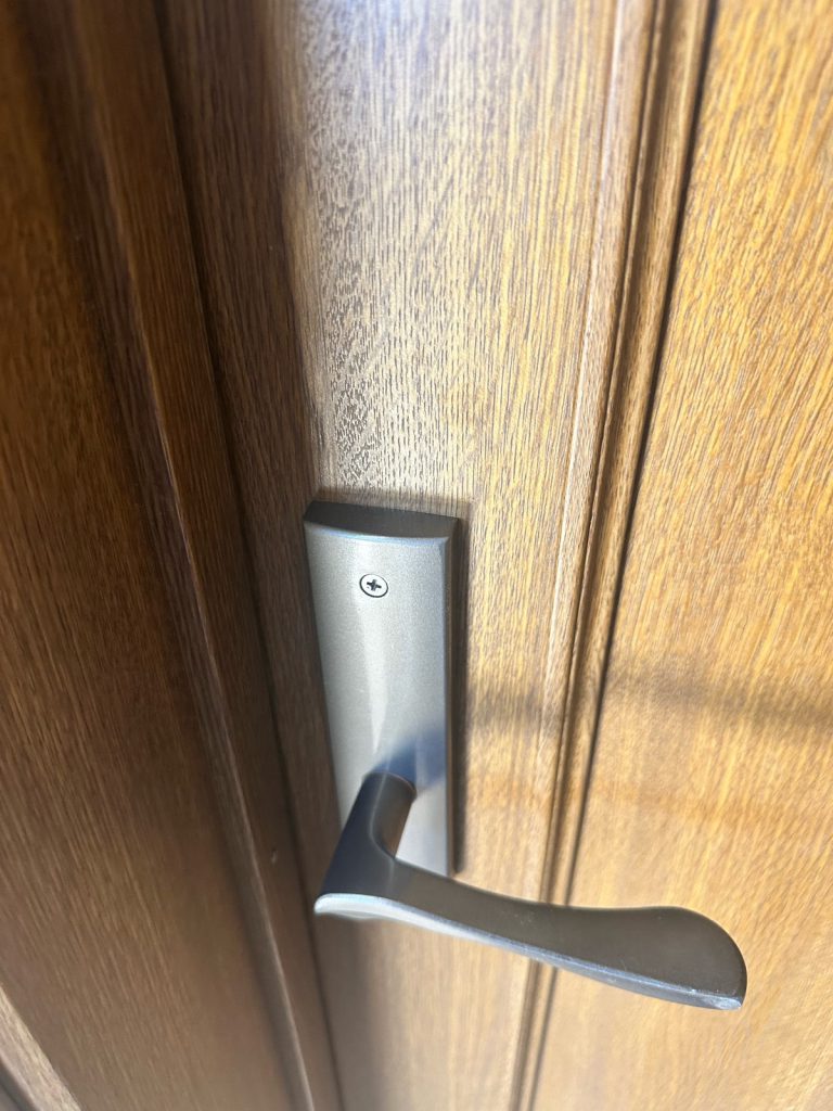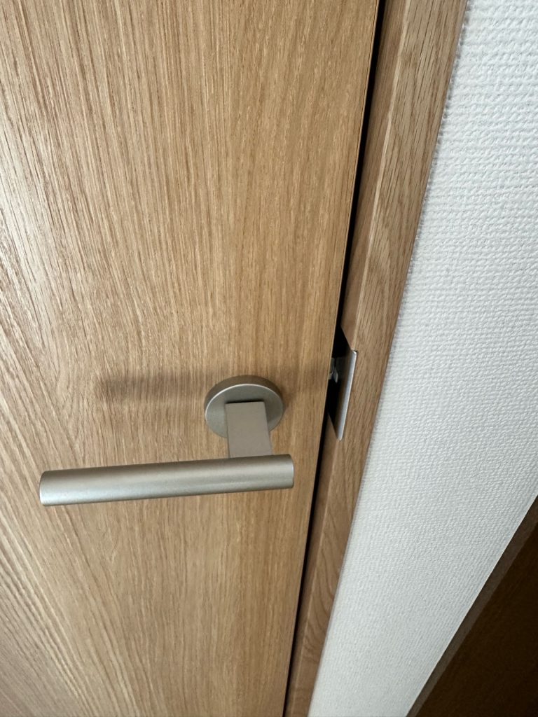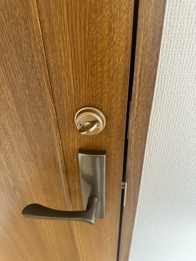 ドア本体はそのまま活かし、穴あけ位置の計測、錠前本体の取り付け、ラッチのかかり具合や開閉の重さの調整まで丁寧に施工しました。
